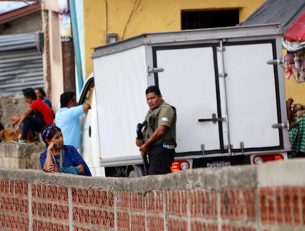 Volvimos a ver un coche de refrescos que iba escoltado por un vigilante con rifle, pararon para hacer el reparto y yo Elisabeth, desde lejos tome una fotografía del vehículo, el vigilante y de una indígena que tranquilamente se encontraba en la zona mirando hacia el Lago Atitlán.