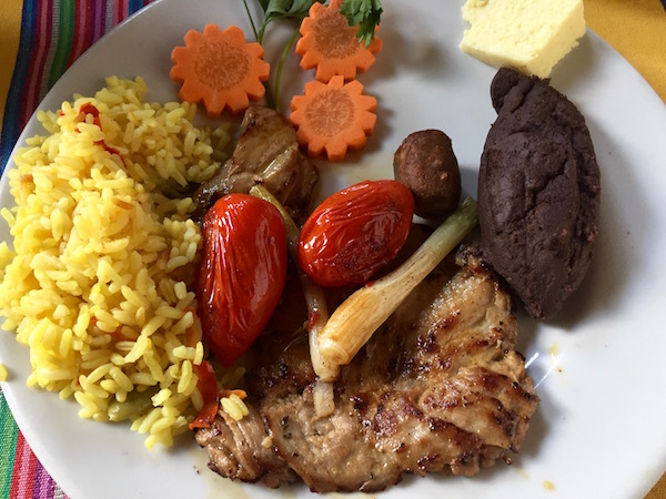 - Carne asada con chirmol, arroz y verduras, Restaurante Hotel Santo Tomás, Chichicastenango.
