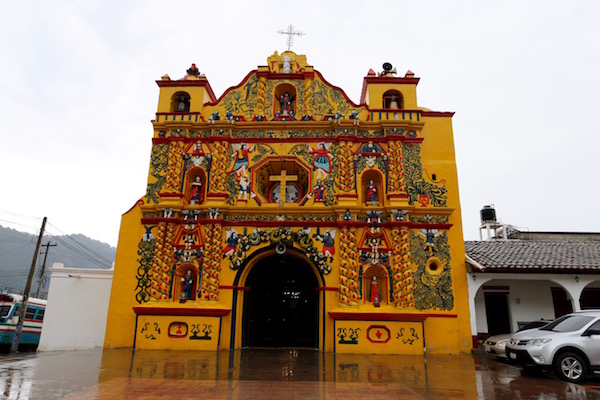 ¡La lluvia no cesaba!, bajamos del coche para ir a visitar la Iglesia de San Andrés Xecul este templo es del siglo XVII, tiene una mezcla en su construcción de la cultura maya y cristiana. Es muy llamativa por tener una fachada de color amarillo con diferentes figuras como: ángeles, Santos, flores, parras, jaguar, etc. En el interior hay imágenes de Cristo, candelabros, rosarios, etc. Accedimos a su interior, no pudimos tomar fotografía ni grabaciones porque está totalmente prohibido, hay un señor que vigila el lugar. El acceso es gratuito.