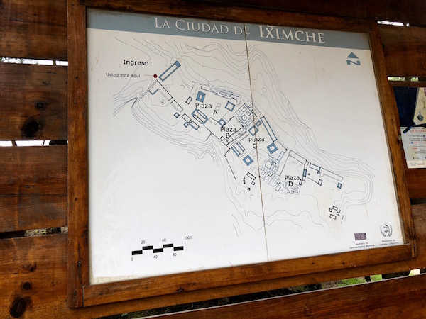 Volvimos al vehículo para ir a visitar el Sitio Arqueológico Precolombino de Iximché. Si traducimos al español, la palabra Iximché, significa literalmente “árbol de maíz” Es un parque arqueológico donde se pueden ver el periodo post-clásico maya. La ciudad fue fundada en el año 1470, siendo abandonada en 1524 por los Kakchiqueles, durante la conquista por parte de los españoles fue incendiada, ellos al llegar establecieron en el lugar su primer cuartel general en Guatemala, Iximché, fue la última capital de los mayas de Kakchiqueles. En 1524 se convirtió en la primera capital de los conquistadores españoles en Guatemala. En 1527 la capital fue traslada hasta el Valle de Almolonga, lo que hoy en día es Ciudad Vieja. Desde el 1964 se encuentra protegida por el Instituto de Antropología e Historia de Guatemala de la dirección General del Patrimonio Cultural y Natural. A la entrada a mano derecha hay un pequeño museo con información y exposiciones, esculturas, trajes, objetos, utensilios y una maqueta de toda la antigua ciudad.