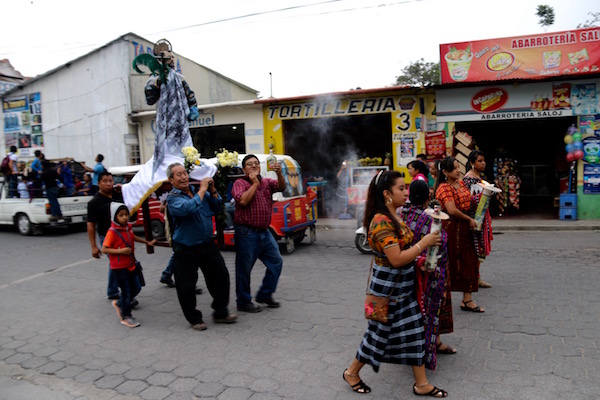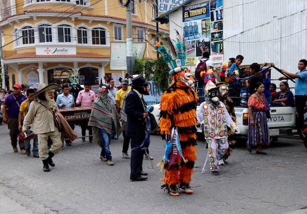 Al salir del supermercado, ¡sorpresa!, tuvimos la oportunidad de ver en Panajachel en la calle una procesión de la celebración del Corpus Christi, es una forma de mostrar su cultura y tradición, se celebra 60 días después del domingo de Resurrección en conmemoración de la eucaristía, está fiesta la llevan festejando hace más de 80 años, van pasando de generación en generación. Vimos el baile de los negritos o Corpus Christi. Los guatemaltecos iban vestidos con diferentes trajes y máscaras exhibían al hombro la imagen del Corpus Christi, la de la Virgen María, así como la del patrón San Francisco de Asís.