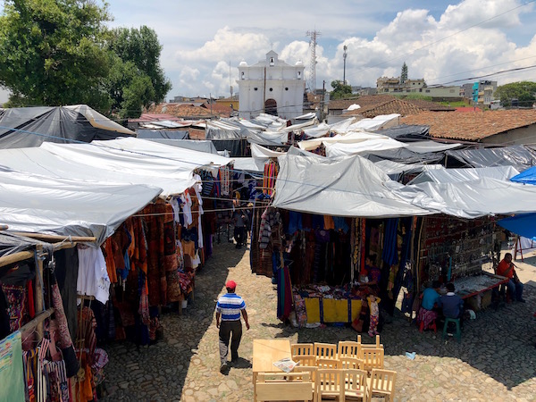 Paseamos por el Mercado al Aire Libre del pueblo, se celebra cada día, siendo los viernes y domingo, cuando mayor gente y puestos hay, aquí se dan cita los lugareños e indígenas de pueblos vecinos, para la venta y compra de carnes, pescados, frutas, verduras, artesanía, pinturas, calzado, textil, etc.
