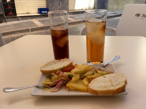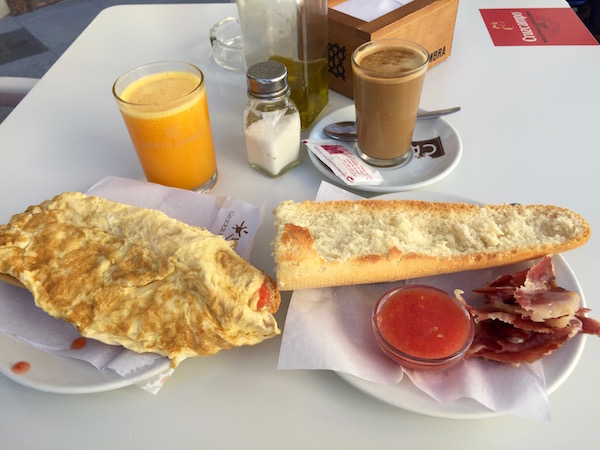 Antes de comenzar con las visitas decidimos ir a desayunar en la Taberna+Cerc@, donde tomamos media tostada de jamón serrano con tomate y para el otro media de huevo batido, un café con leche, un zumo de naranja. Pagamos un total de 6,50 €. Situada en la Plaza Virgen de los Remedios núm. 3.