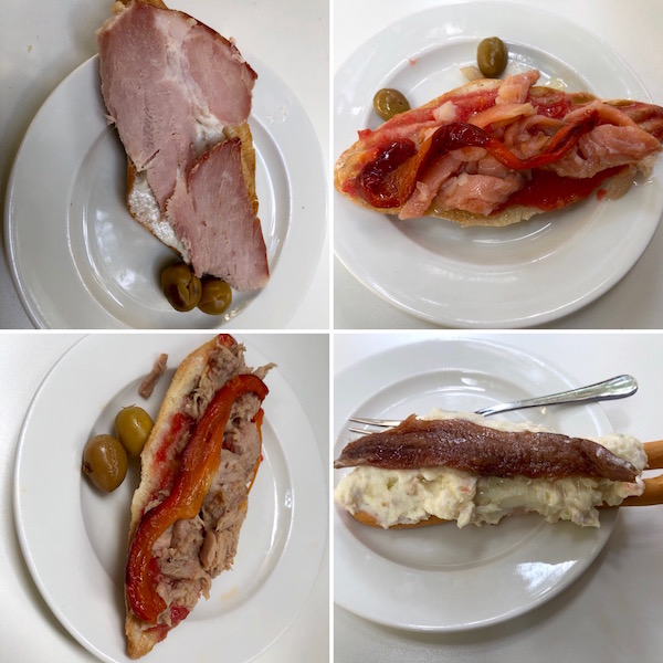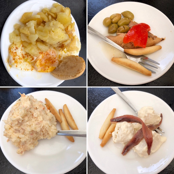 - 1-tapa de patatas a lo pobre con huevo, 2-atún con morrón, 3-ensaladilla rusa, 4-patatas con alioli y anchoas.