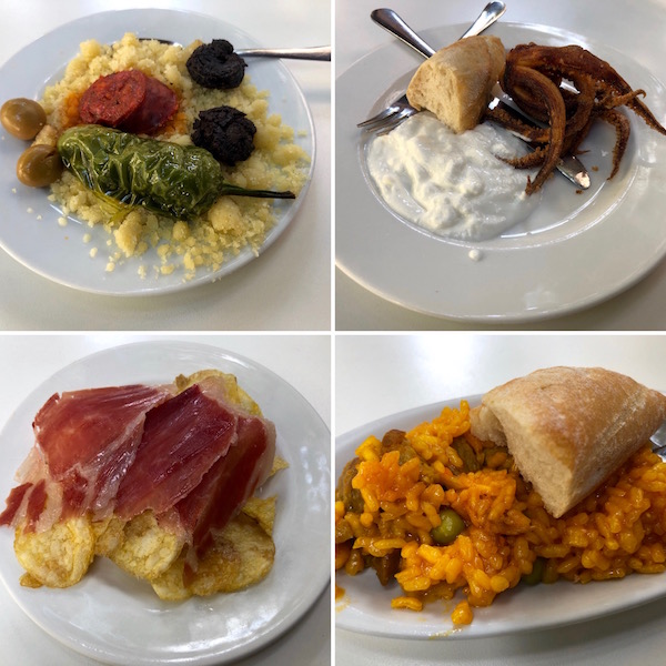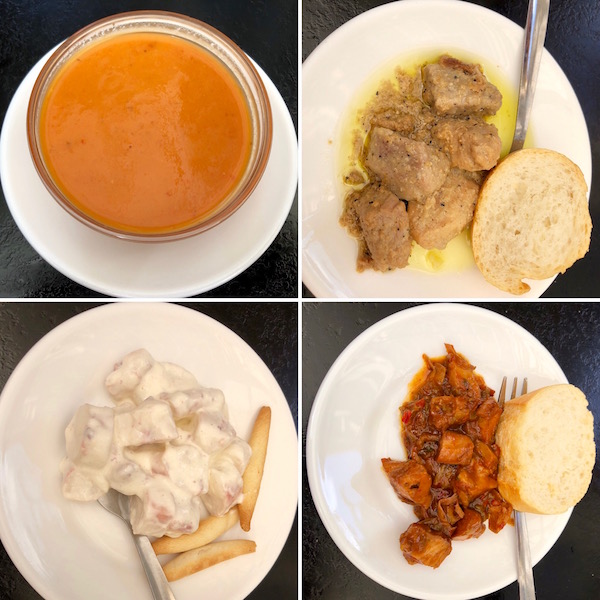 - 1-tapa de gazpacho, 2-lomo frito con ajo, 3-pulpo con alioli, 4-pulpo en fritada.