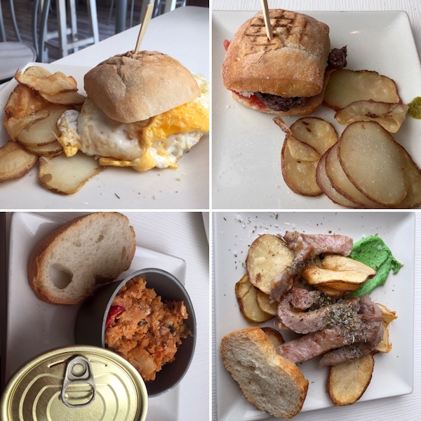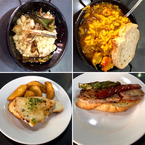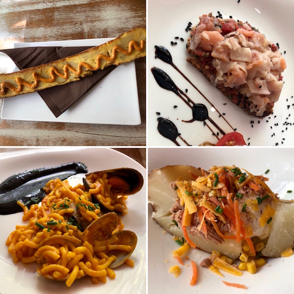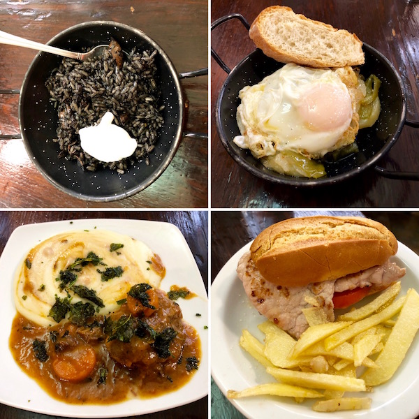 - 1-tapa arroz negro, 2-patatas pobre con huevo, 3-carrillera en salsa con ciruelas y crema de patatas, 4-montadito lomo plancha con tomate.