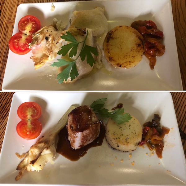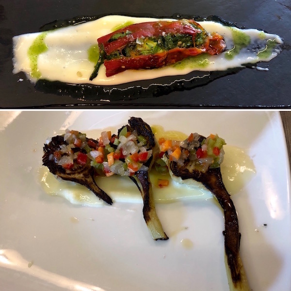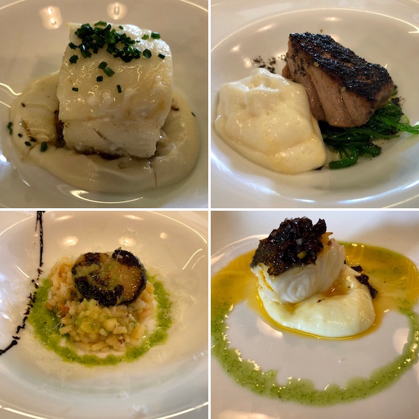 - 1-Pincho bacalao con emulsión de coliflor, 2-atún con soja, 3-risotto con verduras, 4- merluza con tomate seco.