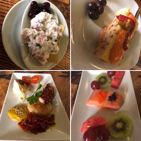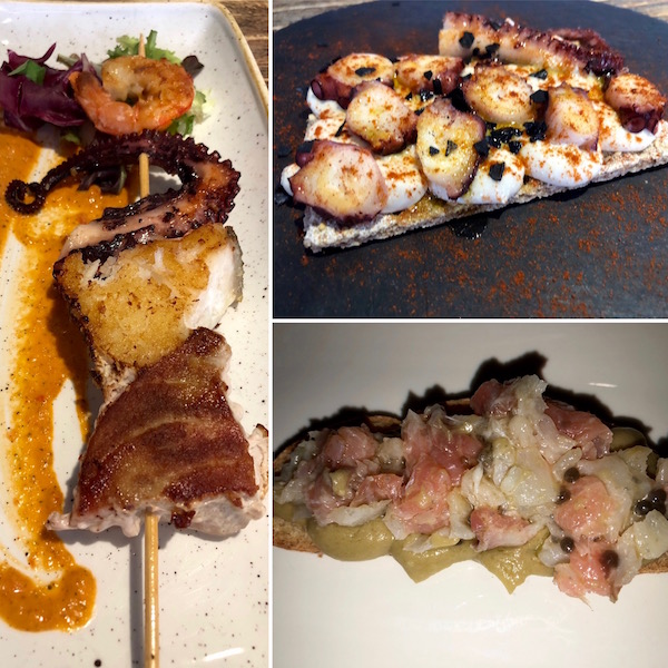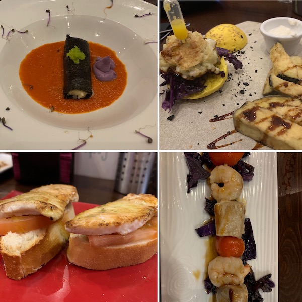 - 1-Tapa de pulpo con alioli, 2-tapa tortilla con salmorejo, 3- taco de pulpo a la parrilla, 4-taco de salmón marina.