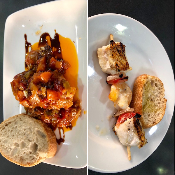 - 1-Tapa bacalao con pisto, 2-pincho de pescado.