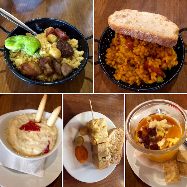 - 1-tapa de migas, 2-arroz, 3-ensaladilla rusa, 4-tortilla española, 5-salmorejo.