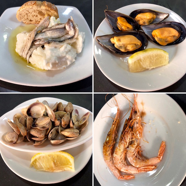 - 1-Tapa patatas con alioli y anchoas,2-mejillones, 3-almejas, 4-gambas.