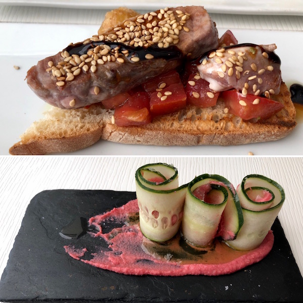 - 1-Tapa tosta de atún, 2-rolls de pepino con humus de remolacha.