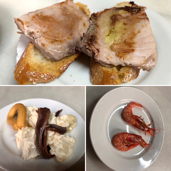 - 1-tapas de atún, 2-unas anchoas con patatas y alioli, 3-gamba roja.