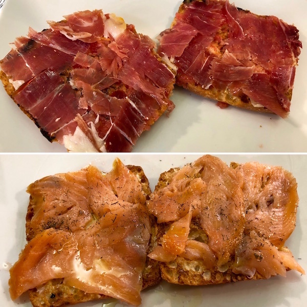 - 1-Tosta de jamón ibérico de bellota, 2-salmón ahumado.