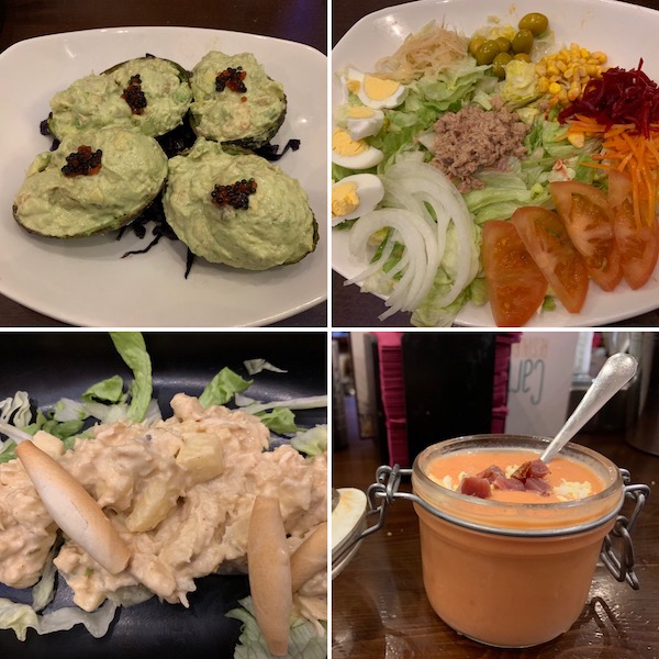 - Aperitivo de Aguacates, ensalada de la huerta, tapas ensaladilla rusa y salmorejo.