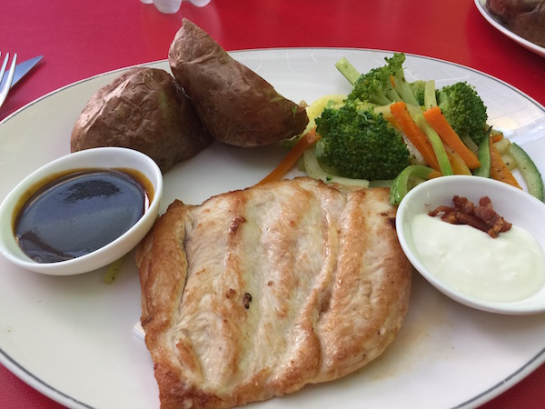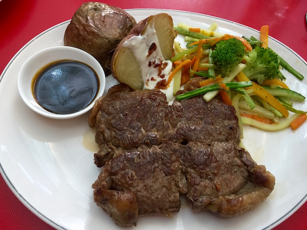 Almorzamos en el Restaurante del Hotel, La Pascana donde pedimos un churrasco del pollo, para el otro un bife de ternera. De bebida dos botellas de agua mineral sin gas. Pagamos un total de 164 bolivianos (20,50 € aproximadamente). Ofrece comida local, americana, mexicana y latina. La dirección Calle 24 de Septiembre, zona del casco viejo.