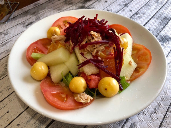 Decidimos almorzar en el Bar Restaurante Casa Julio donde pedimos una ensalada mixta, un gazpacho andaluz, de plato principal, para uno fue unas migas de pan y para el otro un entrecot de ternera acompañado de patatas a lo pobre, de bebida dos nesteas. Pagamos un total de 35,80 €. Ofrece comida española, mediterránea, europea y opción vegetariana. Dispone de dos comedores interiores y una terraza bar. Abierto todo el año. El teléfono es: (+34)958763322. Situado en la Avenida Alpujarra núm. 9, Pampaneira.