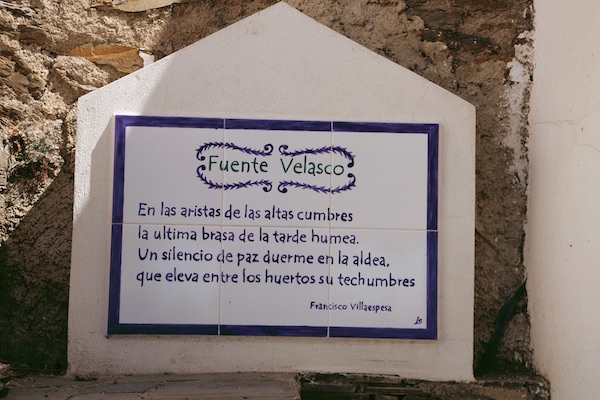 La Fuente Velasco es un pequeño manantial con un caño, construida en piedra de pizarra, en ella han colocado unos azulejos con el siguiente texto: «En las aristas de las altas cumbres, la última brasa de la tarde humea. Un silencio de paz duerme en la aldea, que eleva entre los huertos su techumbre» Francisco Villaespesa. Está en un espacio al aire libre, el acceso es gratuito. Ubicada al final de la Calle Fuente Velasco, situada en el barrio alto.