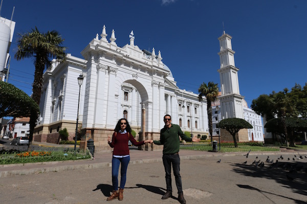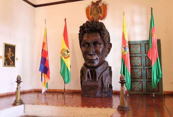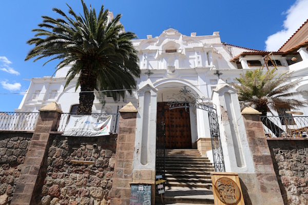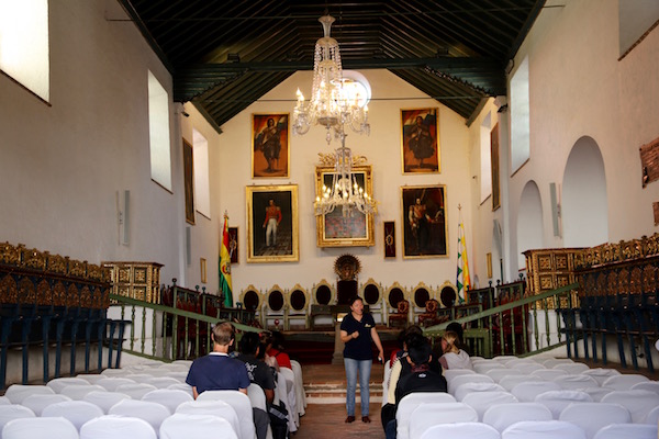 A escasos metros llegamos hasta la Casa de la Libertad es un monumento histórico, inmueble colonial, religioso y universitario de la orden de los Jesuitas. En el salón de la Independencia se proclamó la Independencia del Alto Perú o Charcas el 6 de agosto del 1825. Desde ese hecho hasta el 1898 era el lugar de reunión del Congreso Boliviano. Hoy en día es un Museo Histórico Nacional, hay una Biblioteca-Archivo especializado en historia y geografía y una Mapoteca antigua. Las visitas son guiadas en castellano, inglés, francés y quechua. En él se puede ver la sala virreinal, el salón de la independencia, la sala de los guerrilleros, bandera de Macha, de los firmantes, la galería de los presidentes, la del Mariscal de Sucre y el de honor. La entrada para extranjeros nos costó 15 bolivianos por persona (1,89 € aproximadamente) los nacionales pagan 10 bolivianos por cada uno (1,26 € aprox.) los estudiantes nacionales tienen el ingreso gratuito. Para poder hacer fotografías sin flash y grabaciones hay que pagar una tasa de 15 bolivianos (1,89 € aproximadamente). El horario de visitas es de martes a sábados de 9:00 h a 12:30 h por la tarde de 14:30 h a 18:30 h, los domingos de 9:00 h a 12:00 h. Para más información visitar la página web: casadelalibertad.org.bo El teléfono de contacto es: 6454200. Ubicada en Plaza 25 de Mayo núm. 11.