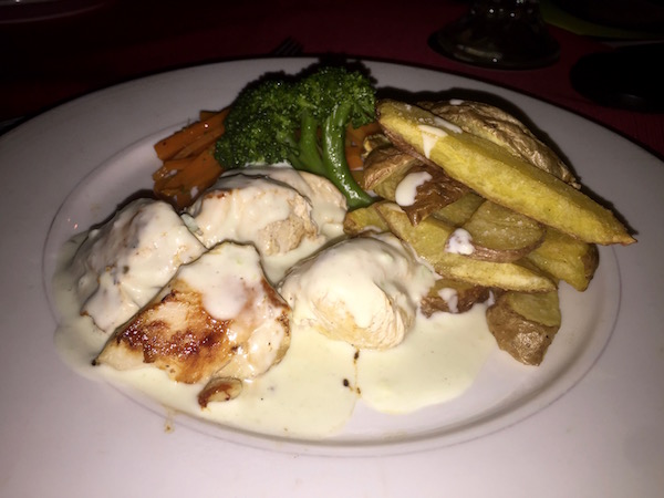 - Cena en Origenes espacio cultural, pollo salsa queso.