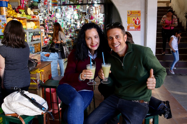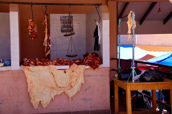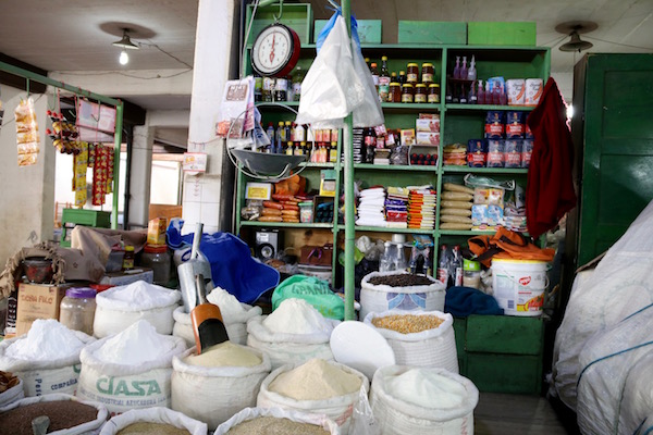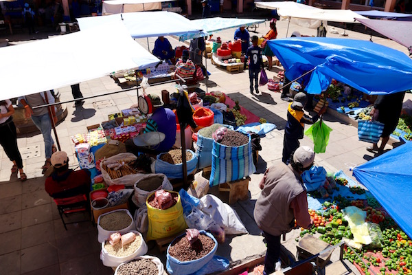 Visitamos el Mercado Central en este mercado pudimos ver como los lugareños van a hacer la compra al lugar, hay de todo, puestos de carnes, pescados, frutas, verduras, remedios medicinales, patio de comidas, (donde probar típica comida boliviana), etc. En la zona pudimos experimentar los cinco sentidos, olfato, vista, tacto, odio y gusto. Después de dar una vuelta en él, cogimos asiento en unos taburetes de un puesto de fruta, donde pedimos dos jugos de kiwi, te lo pueden hacer de agua o con leche. En este tipo de mercados, cuando compras algo, se pide el servicio de «llapa», esto quiere decir, un aumento del producto. Pagamos por los dos jugos un total de 10 bolivianos (1,27 € aproximadamente). El mercado se localiza en Junin núm. 366.