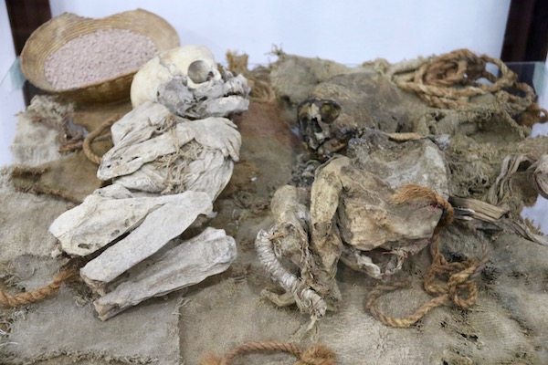 Subimos hasta la habitación, dejamos el equipaje y caminando llegamos hasta Museos Universitarios Charcas, en él se encuentra el de Arqueología y Antropología, el Colonial, la Galería de Arte Moderno y Contemporáneo. A la entrada hay que dejar las pertenencias como: mochilas, bolsos, etc., en una taquilla. Únicamente permiten tomar fotografías sin flash en el museo de arqueología y antropología. Nosotros solo entramos en este que permitían hacer fotografías. La entrada para extranjeros nos costó 15 bolivianos por persona (1,89 € aproximadamente) los nacionales pagan 10 bolivianos por cada uno (1,26 € aprox.) los estudiantes mayores de 10 años es de 5 bolivianos por persona (0,64 € aprox.) Los Museos Universitarios fueron creados el 27 de mayo del 1939 por Ateneo de Bellas Artes Chuquisaca, en el año 1957 paso a ser propiedad de la Universidad Mayor Real Pontificia de San Francisco Xavier de Chuquisaca. El Museo de Arqueología y Antropología, desde el año 1944, acoge el material arqueológico del departamento de Chuquisaca. En él pudimos ver una zona destinada a arqueología, folklore y etnografía. Desde obras desde hace 3.500 años hasta la ocupación de la colonización española siglo XVI. Siendo lo más llamativo los cuerpos momificados y cráneos trepanados del periodo precolombino y a varias culturas ancestrales. Abierto de lunes a viernes de 9:00 h a 12:30 h por la tarde de 14:30 h a 18:30 h, los sábados mañana de 9:30 h a 12:30 h, los domingos permanece cerrado. El teléfono es: 6453285. La dirección es Bolívar núm. 689. El ingreso al Museo Colonial Charcas y Galería de Arte Moderno para extranjeros cuestan 30 bolivianos por persona (3,77 € aproximadamente) los nacionales es de 20 bolivianos por cada uno (2,51 € aprox.) los estudiantes mayores de 10 años es de 10 bolivianos por persona (1,26 € aproximadamente) el ingreso de grupos de estudiantes es de 1 boliviano por cada uno (0,14 € aprox.)