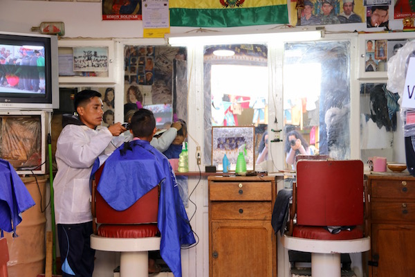 Pasamos por la puerta de la peluquería barbería que hay en el pueblo, apreciamos como a un niño le estaban cortando el pelo. Esto nos indica, que su familia tiene un alto nivel económico, allí en Tarabuco, no todo el mundo tiene acceso a este tipo de servicio, para ellos es un artículo de lujo.