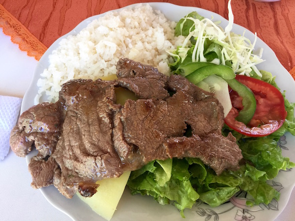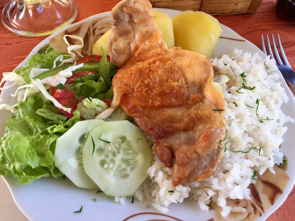 Almorzamos en el Restaurante Samay Wasi donde pedimos un menú, buffet, ensalada, sopa de maní, (lleva maíz, arroz, papa, arvejas, carne de res o pollo) plato principal para uno fue lomo (ternera) con guarnición de ensalada y arroz, para el otro pollo a la plancha acompañado de patata y arroz. El postre gelatina, de bebida, un zumo de limón y una coca cola. Pagamos un total de 100 bolivianos (12,60 € aproximadamente).