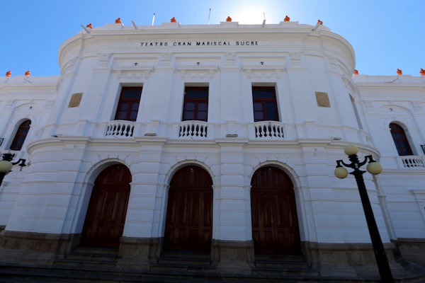 Pasamos por la puerta del Teatro Gran Mariscal de Sucre inmueble construido en la segunda década del siglo XX, lo diseñó el arquitecto Domingo Camponovo, de estilo ecléctico, con decorativos clasicistas y arte decó. Hoy en día pertenece a la Universidad de San Francisco Xavier, donde hay algunas dependencias de esta, es también utilizado para actuaciones artísticas. Ubicado en Calle Arenales.