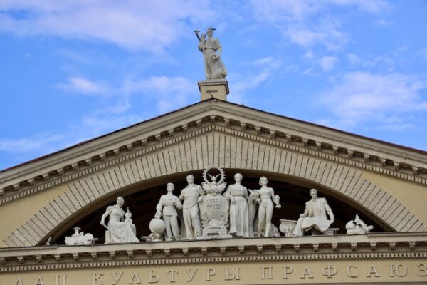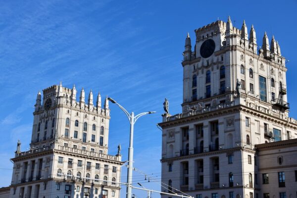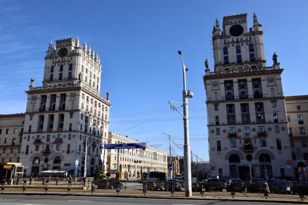 La Puerta de Minsk (Менская брама) es un complejo arquitectónico, formado por dos grandes edificios coronados por sus torres de 11 metros. Las torres están decoradas con una gran esfera de un reloj alemán, el escudo de armas de la URSS y esculturas de un soldado, un granjero colectivo, un obrero y un ingeniero. Fue diseñado por el arquitecto Boris Rubanenko a finales de los años cuarenta. Construidas en estilo estalinista. Solo se puede contemplar exteriormente, en sus bajos hay restaurantes y locales de ocio. 📬 Dirección: Localizada frente a la estación de trenes, Mira St. Minsk, Belarus.