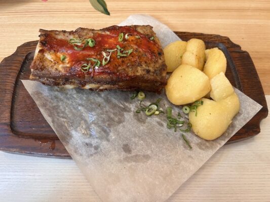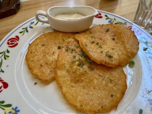 Almorzamos en Vasilki, restaurante que ofrece una experiencia tradicional y económica. Aquí pedimos como entrante draniki (tortillas de patatas frita), de plato principal para uno fue unas empanadas caseras al horno en crema de jamón y champiñones a la miel, para el otro una costilla de cerdo. De bebida una botella de agua mineral sin gas y un refresco. Pagamos un total de 70,80 BYN (18,43 €). ⏱ Abierto:, de domingo a jueves de 11:00 h a 23:00 h y los viernes y sábados de 11:00 h a 02:00 h. ☎️ +375297067034. La web: https://vasilki.by 📬 Dirección: 37, Ya. Kolasaa St. Mc `Iceberg.