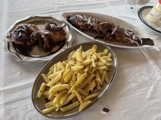 El Sitio Turístico de Ebogo hay un restaurante sobre pilotes, ofrece pescado de agua dulce, carne de caza y pollo. Almorzamos en él, pedimos un pescado de agua dulce acompañado de patatas fritas, y un plato de pollo. De bebida una botella de agua mineral sin gas y un refresco. Pagamos un total de 25000 XAF (38,11 €). ¡No olvides!, es necesario reservar con antelación las comidas.