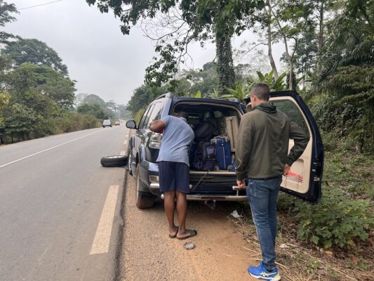 En este viaje estuvimos acompañados de un guía de habla hispana (Saidou), nos hizo pasar unos increíbles días en Camerún. Eso sí, el conductor que tuvimos no fue muy acertado, poco profesional (siempre llegaba tarde). El primer día de viaje ya tuvimos un pequeño percance con el coche, se subió a una rotonda, volamos por los aires, esto hizo estropear el vehículo 4×4, dañó la dirección, y le ocasionó daños a los neumáticos, que al día siguiente, reventara una rueda, y dos días más tarde otras dos. Saidou, se cansó del comportamiento del chofer y a mitad del viaje decidió de cambiar de conductor y vehículo y fue todo un acierto.