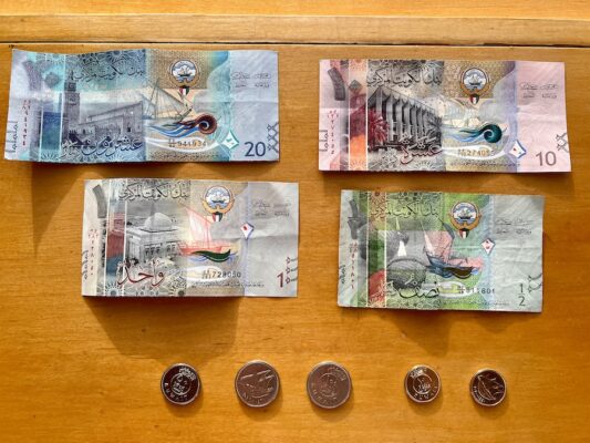 La moneda en Kuwait es el dinar Kuwaití (KWD), hay billetes de ¼, ½, 1, 5, 10, 20 dinares, monedas de 1, 5, 10, 20, 50, 100 fils. Es conocida como una de las monedas más estables del mundo. 1 € = 0,36 KWD. Los bancos están distribuidos por toda la ciudad. Encontrarás cambistas estos pueden ofrecer precios algo mejores que los bancos y suelen cobrar menos comisiones.