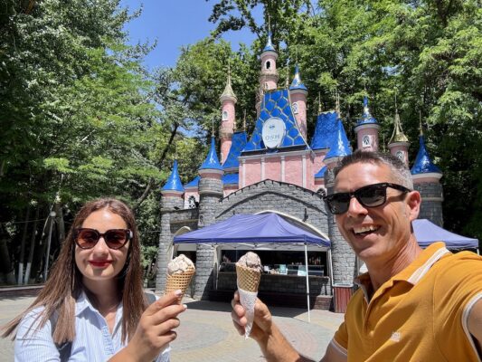 Acudimos a la Heladería Muzday, es muy famosa en la ciudad de Osh, aquí probamos un helado de oreo y para el otro de un sabor tradicional snickers. Pagamos un total de 180 KGS (1,77 €). 📬 La dirección Calle Lenin 212, GR85+8C9, Toktogul Park, Osh, Kirguistán.
