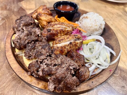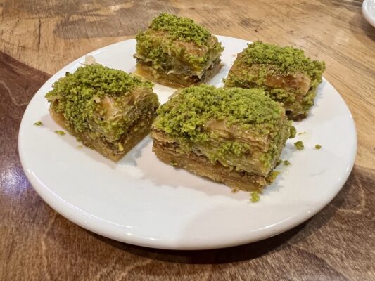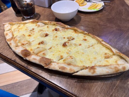 Una comida la hicimos en el restaurante turco Ojak kebap donde pedimos un surtido de kebab y una pizza turca con queso, de postre baklava con pistacho. De bebida una botella de agua mineral sin gas, un refresco y té verde con limón. Pagamos un total de 2216 KGS (21,83 €). ⏱ Abierto 24 h. ☎️ +996554000089. 📬 Se encuentra 234، 246 Kurmanjan-Datka St, Osh, Kirguistán.