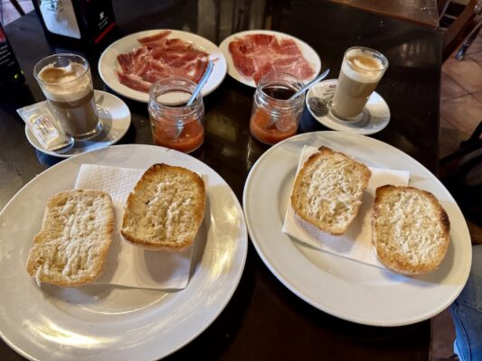Desayunamos en el Restaurante la Plancha, donde pedimos dos medias tostadas de tomate, aceite y jamón serrano y dos cafés con leche, para personas con intolerancia, disponen de leche sin lactosa.💰Pagamos un total de 8 €.⏱ Abierto de miércoles a domingo de 6:00 h a 23:00 h, los martes de 6:00 h a 12:00 h. ☎️ El teléfono es: 672516800. 📬 Se encuentra en la Plaza de España 23, 14880, Luque, Córdoba.