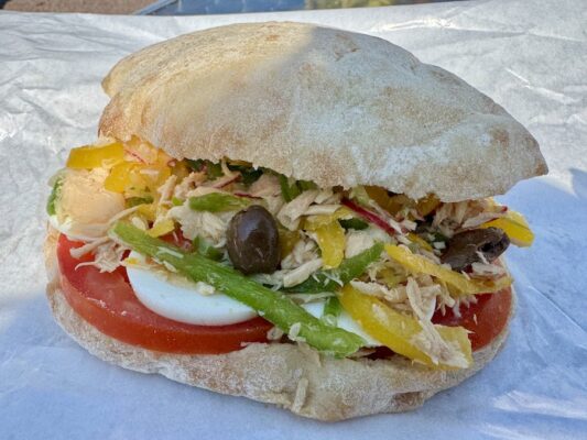 Otra comida en un puesto portátil donde compramos dos sandwiches Nicosis, y botella de agua mineral sin gas y dos refrescos. Pagamos un total de 36 €.
