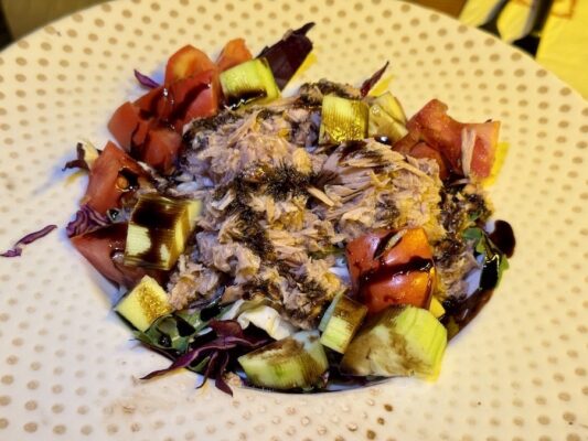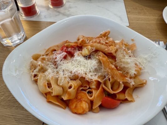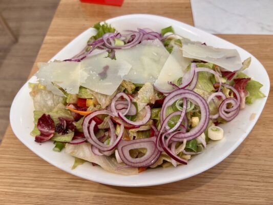 Otra comida la hicimos en Vapiano, restaurante informal que ofrece platos de pasta fresca preparados al gusto, así como pizzas y ensaladas. Pedimos como entrante una brocheta (dos rebanadas tostadas de pan ciabatta, tomates marinados, ajo y rúcula), una ensalada mixta, de plato principal, dos platos de tagliatelles con salsa Gamberetti. De bebida una botella de agua mineral sin gas. Pagamos un total de 30,10 €. Aceptan pagos en efectivo y tarjeta de crédito. ⏱ Abierto de 10:00 h a 23:00 h. ☎️ El teléfono es: +38348380038. 📬 La dirección es Rr, Nr. 120 Ukshin Hoti, Prishtina 10000.