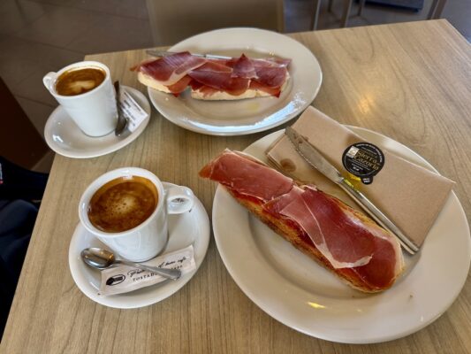Desayunamos en la Cafetería Saqura, donde pedimos dos medias tostadas de jamón serrano con tomate y aceite, de bebida dos cafés con leche. Para personas con intolerancia disponen de leche sin lactosa. Pagamos un total de 7,50 €. Aceptan pagos en efectivo y con tarjeta de crédito. 📬 La dirección es C. de San Vicente, 28, 23379, Segura de la Sierra, Jaén.