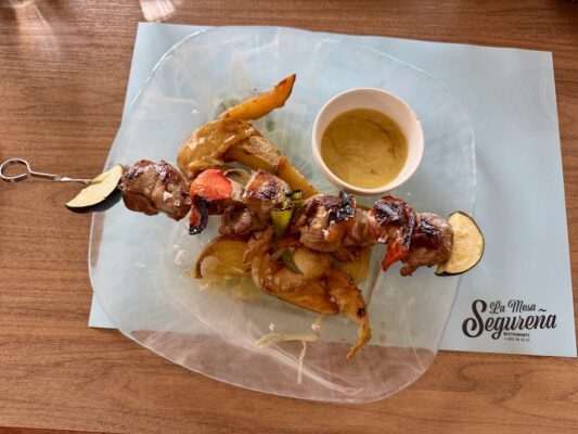 Almorzamos en el Restaurante La Mesa Segureña, donde pedimos como entrante una ensalada de lomo de orza, de plato principal para uno fue una brocheta de cordero segureño y para el otro una pluma ibérica. De bebida una botella de agua mineral sin gas. De postre un café con leche y una infusión.💰Pagamos un total de 70,30 €. Aceptan pagos en efectivo y con tarjeta de crédito. ⏱ Abierto de 13:30 h a 16:00 h y de 21:00 h a 23:00 h, los domingos de 13:00 h a 16:00 h, permanece cerrado los lunes. ☎️ El teléfono es: +34691737357. La web: https://welcomelamesa.wixsite.com/lamesasegurena 📬 La dirección es Calle Postigo 2, 23379, Segura de la Sierra, Jaén.