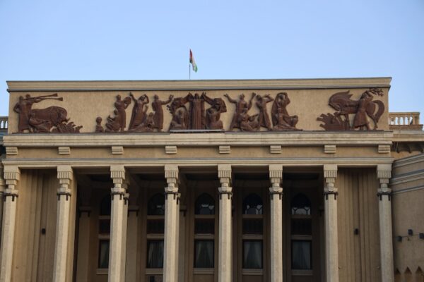 Detalles de la fachada del Teatro Kamoli Khujand, Tayikistán.