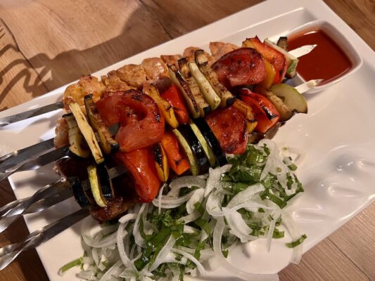 Hicimos una comida en Shashleek, pedimos como entrante, unas empanadillas de carne, de plato principal shashlik (pinchos de cordero, pollo y verduras). De bebida una botella de agua mineral sin gas y un refresco. Pagamos un total de 182 TJS (12,06 €). ⏱ Abierto de 12:00 h a 22:00 h. ☎️ El teléfono es: +9929901440070.📬 La dirección es 7JQ8+24C, Nabiyeva Street, Khujand, Tayikistán.