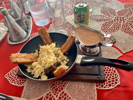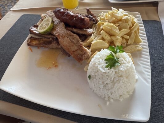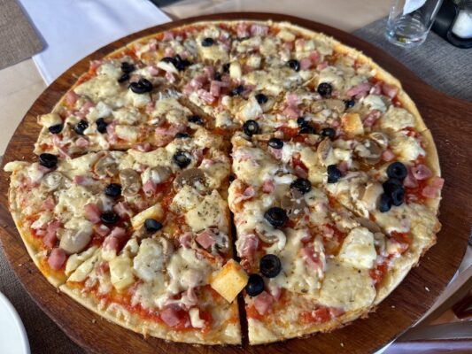 Otra comida la hicimos en Bom Charme; aquí probamos la grelhada mista (parrillada mixta) y una pizza havay charme (hawaiana). Para beber, pedimos dos refrescos y una botella de agua mineral sin gas. 💰Pagamos un total de 29.927,00 Kz (27,87 €). 📬 Situado en Q4HV+JWX, Namibe, Angola.