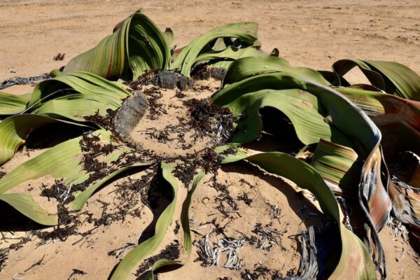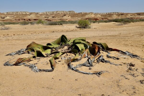 13- Welwitschia mirabilis es una planta endémica del desierto de Namib, entre Angola y Namibia. Morfológicamente tiene un tallo ancho y grueso que no supera el metro y medio de altura; sus hojas, sin embargo, pueden extenderse hasta más de ocho metros. Esta planta es símbolo nacional de Namibia.
