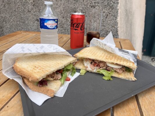 Otra comida la hicimos en La Citadelle, pedimos dos sandwiches de niçoise, de bebida un refresco y una botella de agua mineral sin gas. Pagamos un total de 29 €. Es una buena opción para tomar un sandwiches, helado, café o refresco, ya que no hay nada más en la colina.