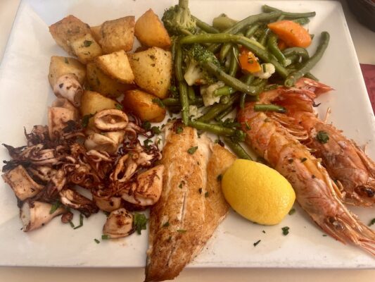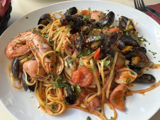 Almorzamos en Gusti Restaurant donde pedimos como entrante una ensalada mixta, de plato principal para uno fue un plato mixto de pescado y para el otro unos linguine frutti di mare. De bebida una botella de agua mineral sin gas.💰Pagamos un total de 56 €.⏱ Abierto de 12:00 h a 23:00 h. ☎️ El teléfono es: +33975469687. La web: https://gusti-restaurant.menu-world.com 📬 La dirección es 37 bis Rue d’Angleterre, 06000 Nice, Francia.