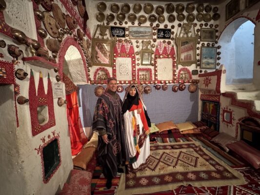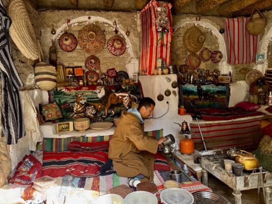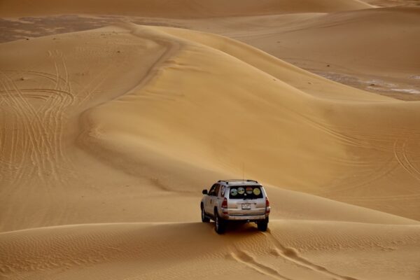 Nosotros realizamos una visita al Desierto de Ghadames en vehículo 4×4, fue una aventura emocionante explorar el paisaje de las dunas subidas y bajadas, ofreciendo adrenalina. Contemplamos el atardecer desde lo alto de una duna y finalizamos la noche bajo las estrellas acompañados de bereberes que nos ofrecieron un típico té libio acompañado con un pan cocinado en la arena del desierto “Taguella” (pan plano, tradicional del pueblo Taureg en el Sahara, hecho de harina y cocido bajo la arena caliente y brasas).