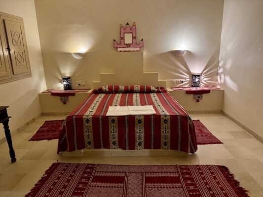 En Ghadames nos hospedamos en Dar Gadamis Hotel, donde pasamos dos noches en alojamiento+desayuno. Está considerado como el mejor hotel de la región, aunque deja un poco que desear, en limpieza, formación, etc. ¡Recuerda!, el desayuno es bastante básico. 📬 La dirección es 4F7R+M8, Ghadamis, Libia.