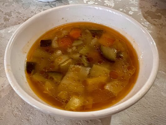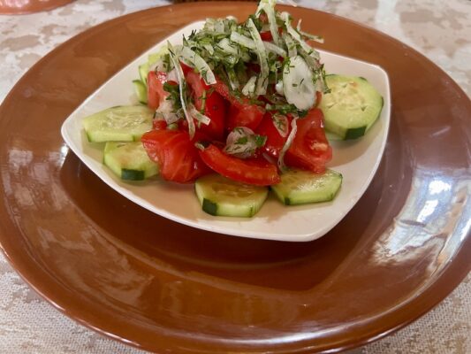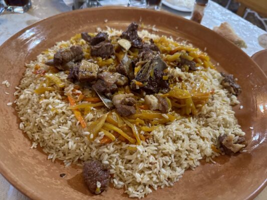 Almorzamos en el restaurante local Sayekhat donde pedimos como entrante una sopa de verduras y una ensalada de tomate, pepino y cebolla, de plato principal plov o pilaf (plato de arroz con carne de cordero o ternera, hortalizas y especias). De bebida una botella de agua mineral sin gas y un refresco. 💰Pagamos un total de 280 TJS (26,37 €).📬 La dirección es FJR2+8HM, Ulitsa Borbadi Marvazi, Panjakent, Tayikistán.